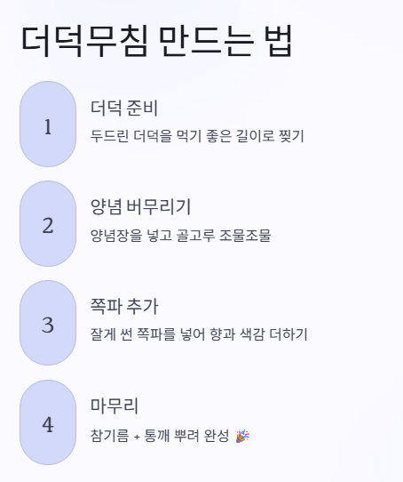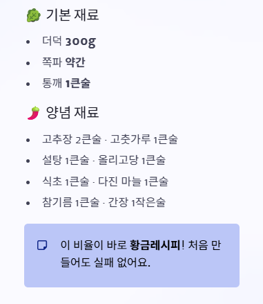 이 양념 비율은 더덕무침 황금레시피라고 불릴 만큼 맛의 균형이 좋아 처음 만드는 분들도 실패 없이 만들 수 있습니다.
