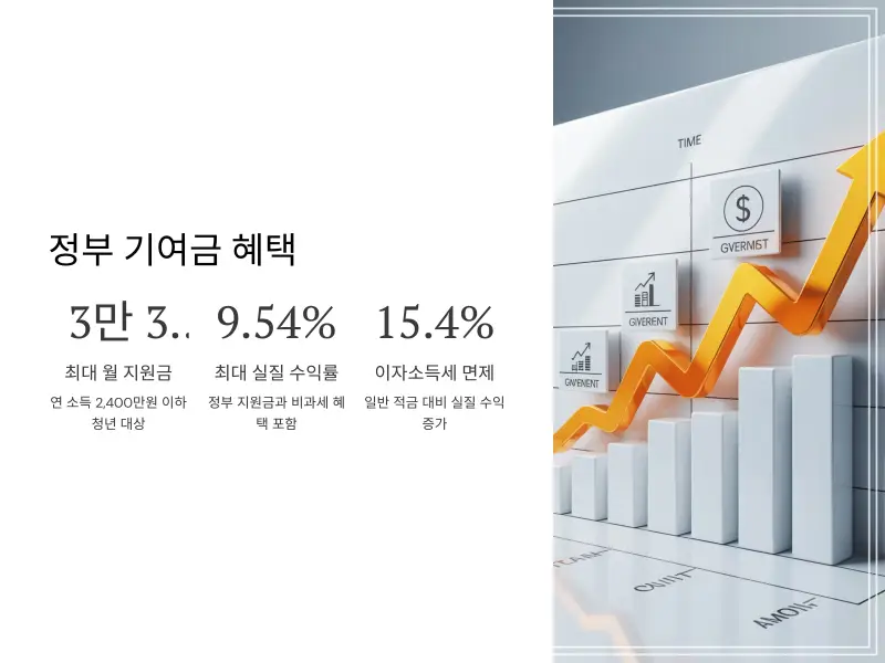 특히 소득이 낮을수록 더 많은 지원금을 받을 수 있어서, 자산 형성을 처음 시작하는 청년들에게 좋은 제도예요. 이자소득세 15.4%도 면제되기 때문에, 실제로 손에 쥐는 수익이 더 커진다는 점도 큰 장점입니다.