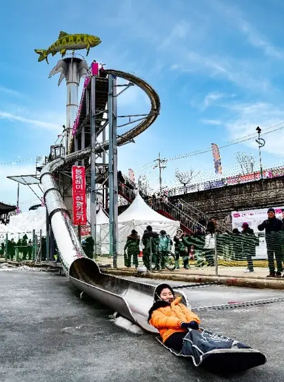 40m 길이의 눈 슬로프와 100m 길이의 아이스 슬로프는 놀라운 속도감을 선사합니다. 산천어축제장의 아름다운 겨울 풍경을 배경으로 짜릿한 썰매 체험을 경험할 수 있어요.
