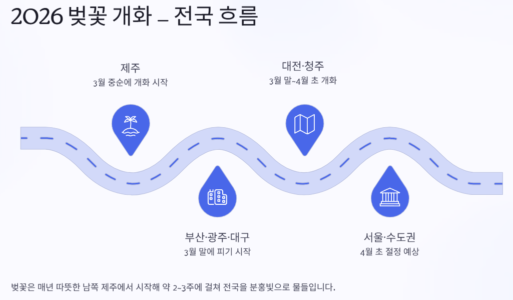 2026년 벚꽃은 제주에서 3월 중순 이후 시작해 남부 지역은 3월 말, 중부 지역은 3월 말에서 4월 초, 그리고 서울과 수도권은 4월 초에 개화할 가능성이 높습니다.