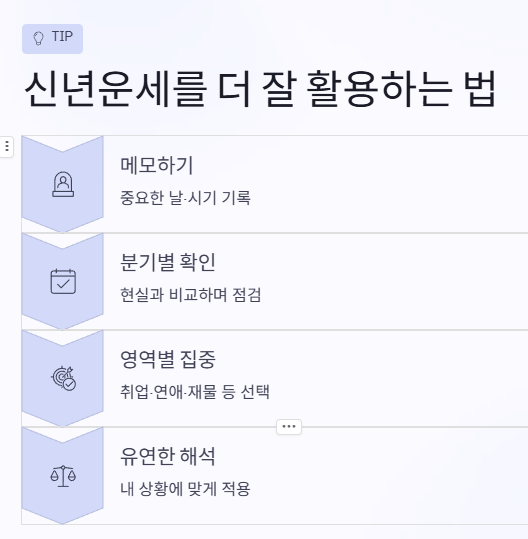 운세를 단순히 보는 데서 끝내지 말고, 중요한 날이나 시기별로 메모해 두는 것도 좋아요. 연초에 큰 흐름을 파악하고, 분기별로 다시 확인하며 현실과 비교해 보는 식이죠. 특히 취업, 연애, 재물운 등 특정 영역에 집중해서 보는 것도 효율적이에요.