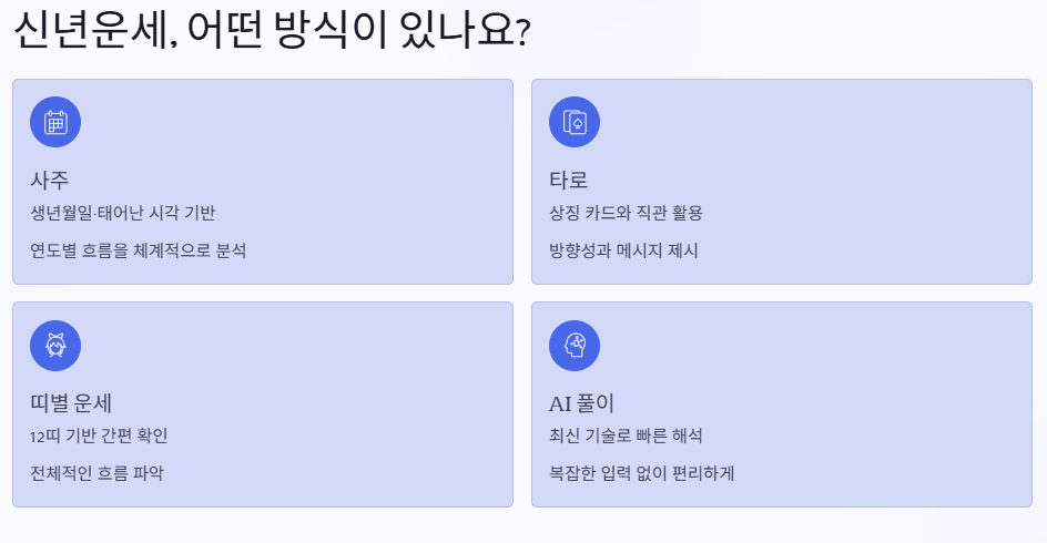 요즘은 AI 기반으로 풀이해 주는 서비스도 많아서, 옛날처럼 복잡하게 입력할 필요도 없어요. 또, 띠별 운세나 별자리 운세처럼 간단하게 살펴볼 수 있는 형식도 함께 제공하는 경우가 많답니다.
