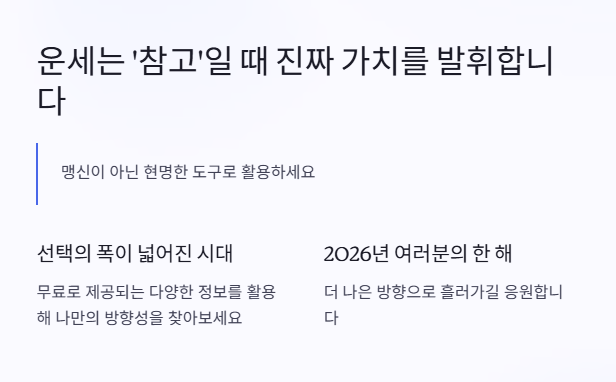 운세는 ‘맹신’이 아닌 ‘참고’ 일 때 진짜 가치를 발휘합니다. 특히 요즘처럼 많은 정보가 무료로 제공되는 시대에는, 선택의 폭이 넓어진 만큼 좋은 도구로 활용하는 것이 중요하겠죠. 2026년, 여러분의 한 해가 더 나은 방향으로 흘러가길 바랍니다.