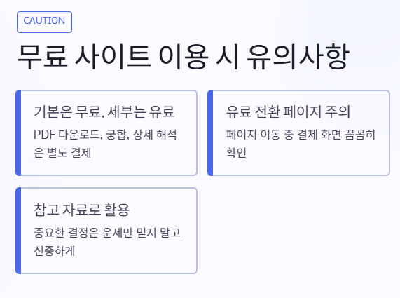 회원가입 없이 빠르게 확인할 수 있어서 접근성이 뛰어나죠. 다만 해석의 깊이는 상대적으로 간단한 편이에요.