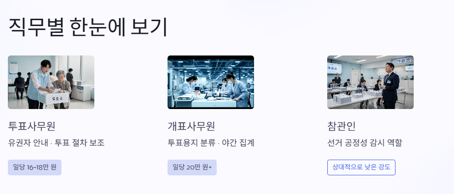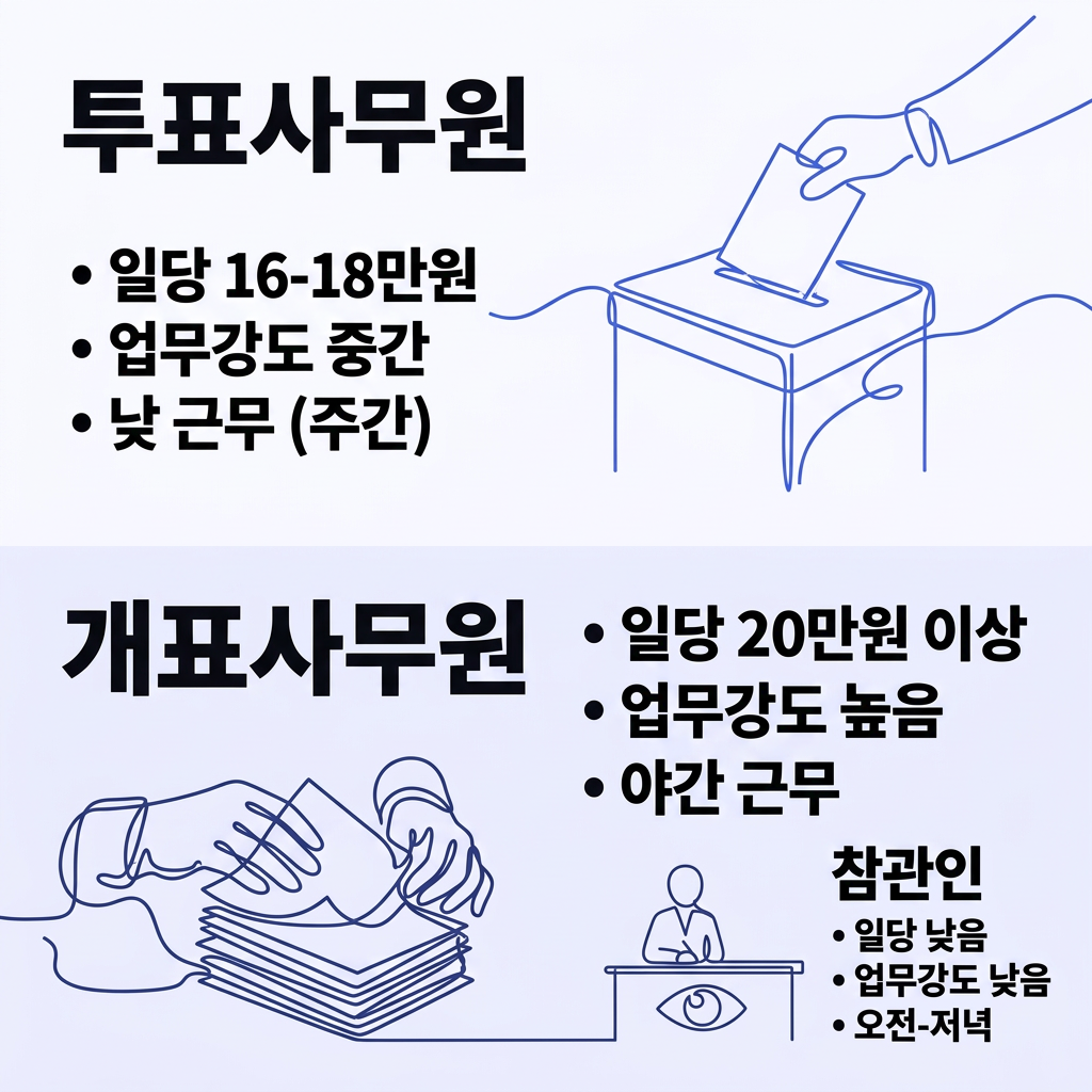 대신 일당은 20만 원 이상으로, 세 가지 유형 중 가장 높은 편에 속해요. 참관인은 선거의 공정성을 감시하는 역할이죠.