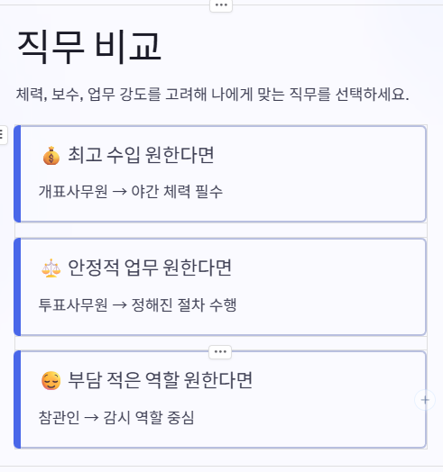 투표사무원은 주로 투표소에서 유권자 안내와 투표 절차 보조 역할을 담당해요. 근무 시간은 길지만, 비교적 안정적이고 정해진 업무를 수행한다는 특징이 있어요.