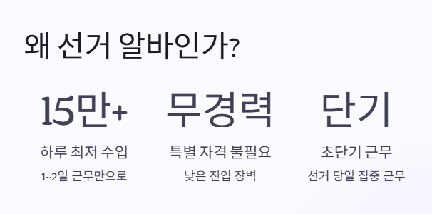 점 때문에 선거 알바는 '단기 고수익' 일자리로 인식되고 있어요. 특별한 자격이나 경력이 없어도 지원이 가능하다는 낮은 진입장벽 또한 폭발적인 지원자 증가의 주요 원인인 거예요.