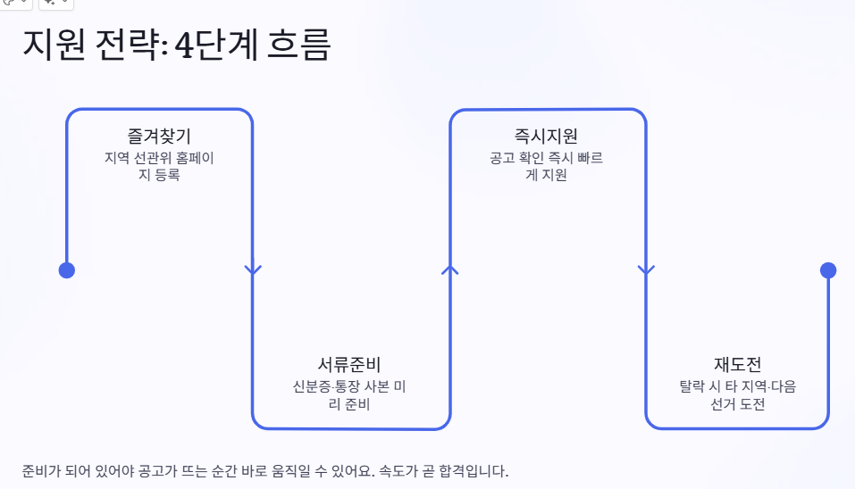 한 번 떨어졌다고 해서 다음 기회를 포기할 필요는 없는 거죠. 합격하지 못했더라도 지역을 넓혀 다시 지원하거나, 다음 선거 때 재도전하는 반복 지원 전략도 유효해요.