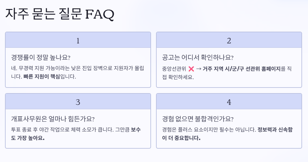 선착순으로 마감되는 지역도 있다는 점을 고려하면, '얼마나 빨리 지원하느냐'가 합격에 결정적인 영향을 미치는 셈이죠. 미리 거주 지역 선관위 홈페이지를 즐겨찾기에 추가하고, 하루에 1~2회 정도 공고를 확인하는 습관을 들이는 게 좋아요.