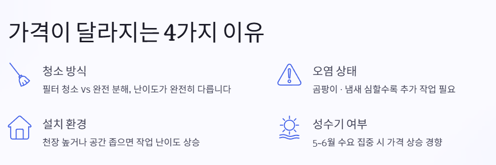 이 차이는 단순한 가격 차이가 아니라 ‘청소 범위의 깊이’에서 발생합니다. 필터만 닦는 간단 청소인지, 내부까지 완전히 분해하는 전문 세척인지에 따라 결과도, 비용도 완전히 달라집니다.