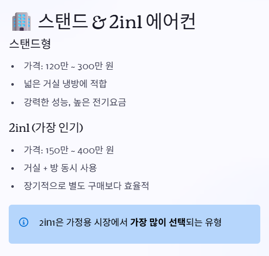 - 특징: 설치 간단, 원룸/소형 공간 적합