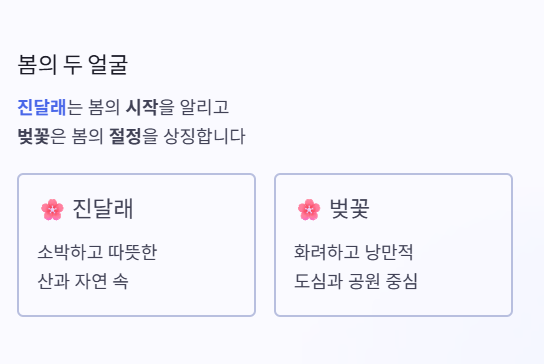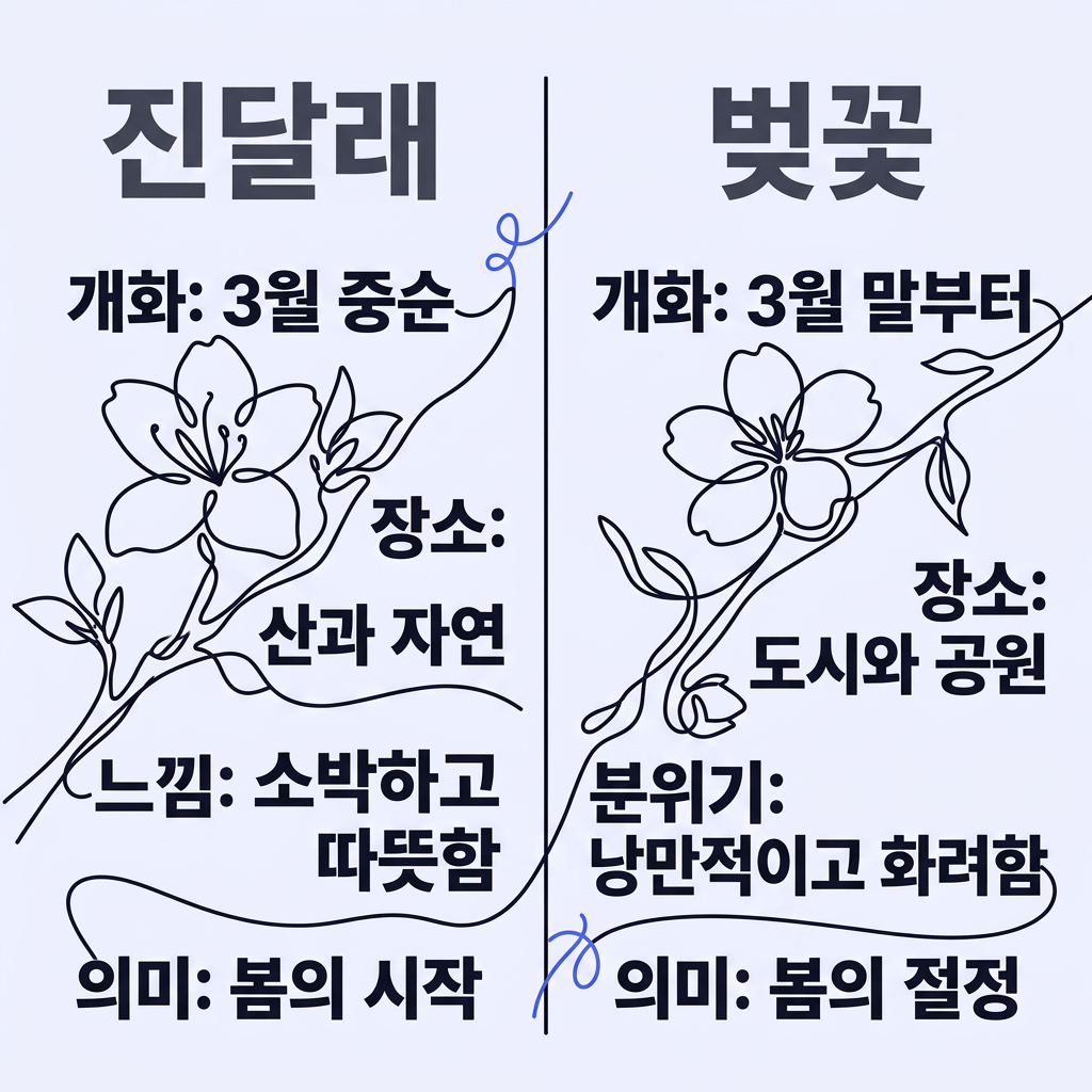 진달래는 소박하고 따뜻한 느낌을 주는 반면, 벚꽃은 화려하고 낭만적인 분위기를 만들어냅니다. 핵심적으로 보면 진달래는 봄의 시작을 알리는 꽃이고, 벚꽃은 봄의 절정을 상징하는 꽃입니다.