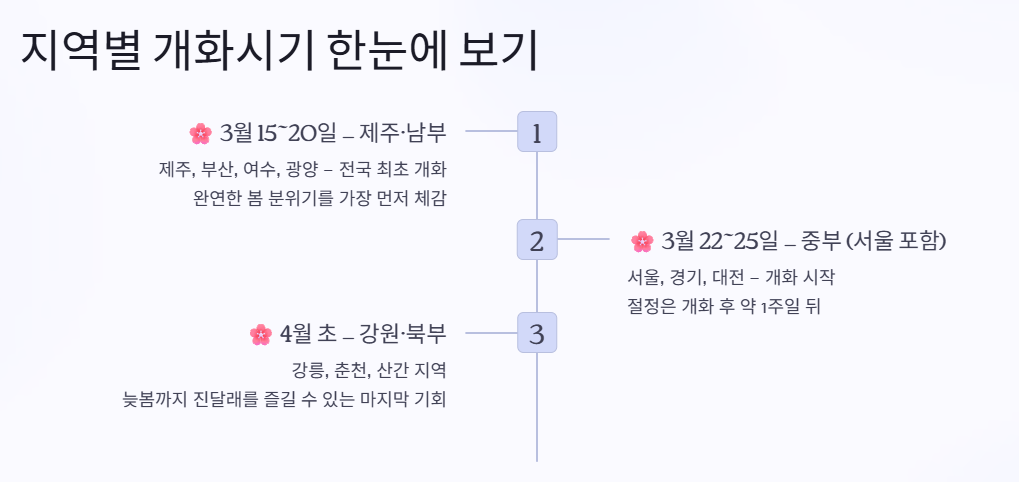 진달래 개화는 지역별 차이가 뚜렷하기 때문에 여행 계획 시 반드시 고려해야 합니다.