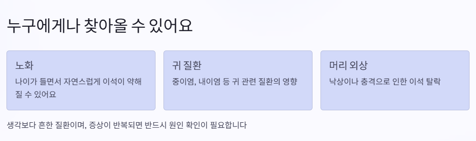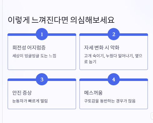 단순히 빈혈이나 스트레스로 인한 어지럼과는 다른 종류죠. 특히 자세를 바꾸거나 고개를 움직일 때 강한 어지럼을 느끼는 게 특징이에요.