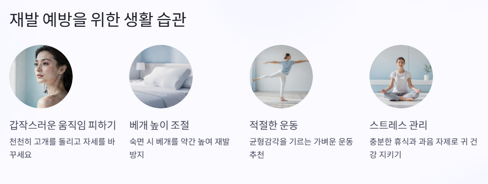 또한, 치료 후에는 증상이 재발하지 않도록 머리 방향 조심, 충분한 휴식, 수면 자세 관리 등이 중요해요.