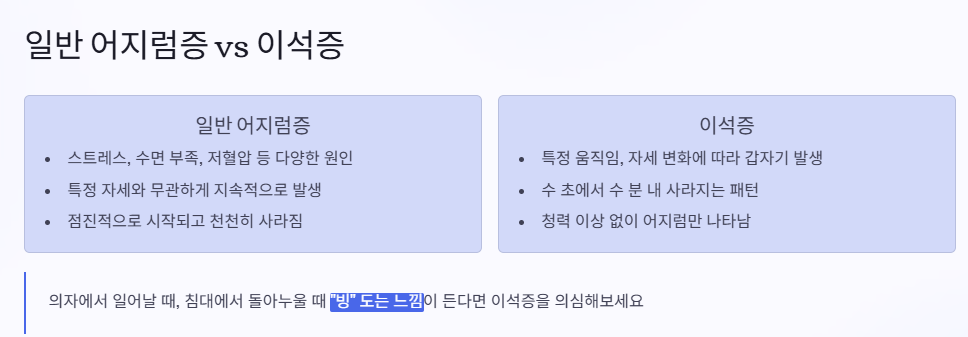 일반적인 어지럼증은 스트레스, 수면 부족, 저혈압 등 다양한 원인에서 비롯될 수 있어요. 하지만 이석증은 특정한 움직임, 자세 변화에 따라 갑자기 발생하는 것이 핵심이에요.