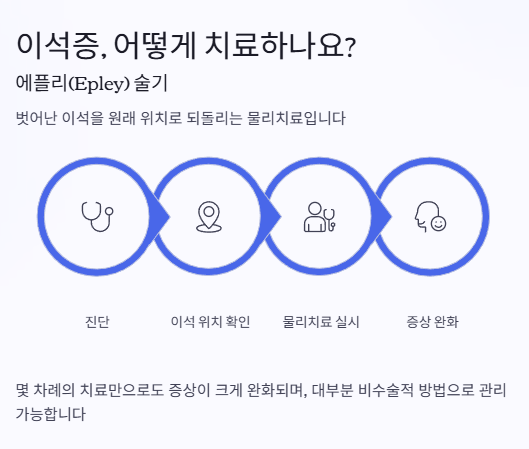가장 일반적인 치료법은 이석을 제자리로 돌려보내는 물리치료예요. 에플리(Epley) 술기 같은 치료 동작을 통해, 벗어난 이석을 원래 위치로 이동시키는 방식이죠.