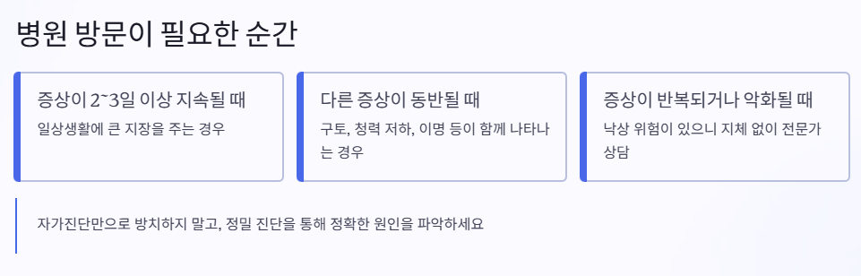 단순한 어지럼인지 이석증인지 헷갈릴 땐, 증상이 2~3일 이상 지속되거나 일상생활에 큰 지장을 준다면 병원을 방문해야 해요. 특히 구토, 청력 저하, 이명 등이 동반되면 다른 질환일 수 있어 꼭 정밀 진단이 필요해요.