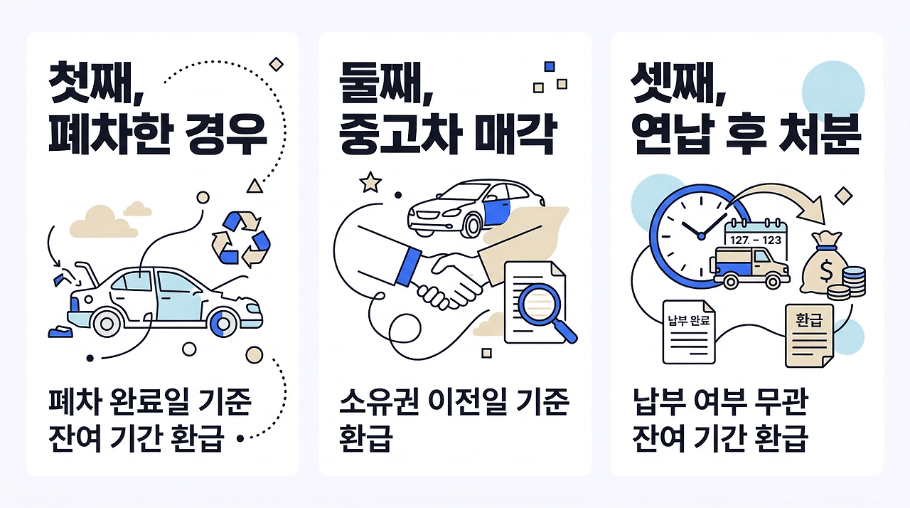 자동차세 환급은 어렵거나 복잡한 과정이 아닙니다. 차량을 폐차하셨을 때, 중고차로 매도하셨을 때, 그리고 연납 후에 차량을 처분하셨을 때 모두 해당입니다.
