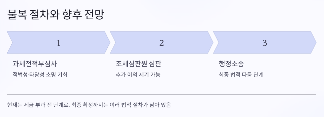그리고 이후에도 납세자는 조세심판원 심판청구나 행정소송 등을 통해 불복할 수 있는 절차를 가지고 있어요. 이번 사건이 법적 다툼으로 이어질 가능성도 배제할 수 없는 상황이에요.
