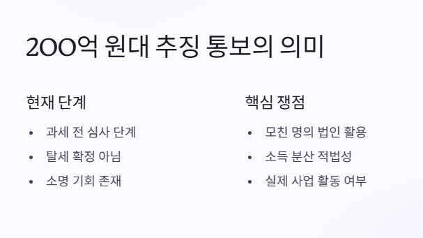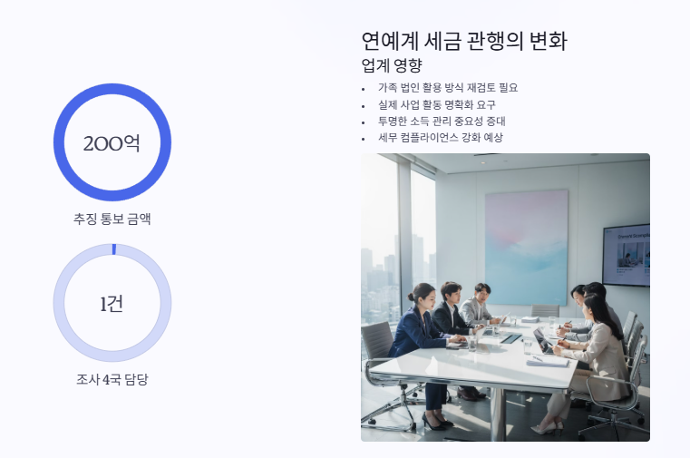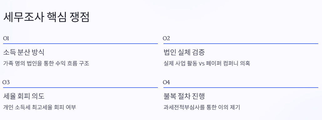 국세청은 특정 연예인의 수익이 과도하게 가족 법인으로 흘러 들어간 정황을 문제 삼은 것으로 보여요. 연예인의 광고료나 출연료 등이 가족 법인을 거쳐 분산될 경우, 소득세율이 낮아지는 효과를 노린 것이 아니냐는 의혹이 제기되는 상황이에요.