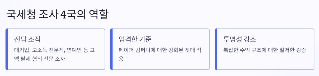 이번 차은우 씨 사건은 국세청 조사 4국에서 담당한 세무조사 결과로 알려져 있어요. 국세청 조사 4국은 주로 대기업이나 고소득 전문직, 연예인 등 고액 탈세 혐의가 있는 경우에 투입되는 특별조직으로 알려져 있어요.