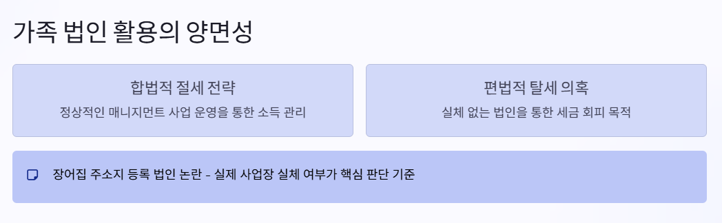 이런 가족 법인 활용은 세법상 합법적인 '절세'와 위법적인 '탈세'의 경계선에 놓여 있을 때가 많아요. 법인을 통해 소득을 분산하면 개인 소득세 최고세율을 회피할 수 있는 여지가 생기거든요.