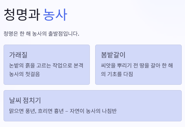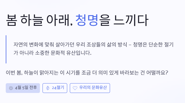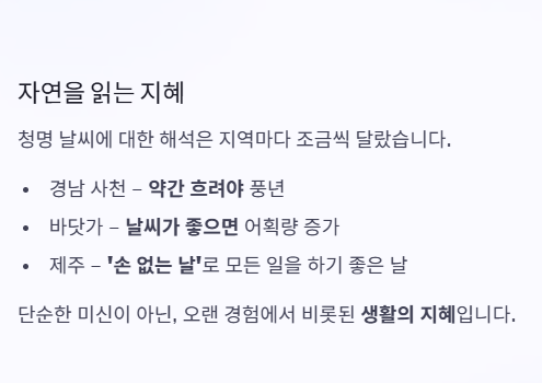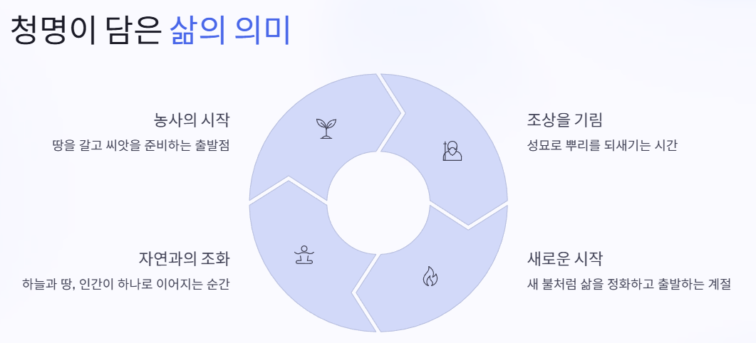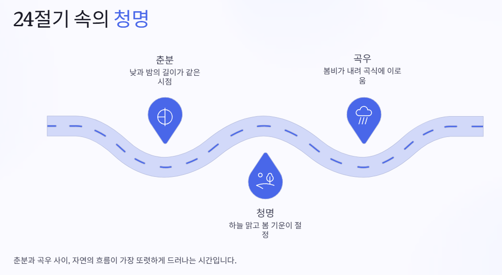 이 모든 요소가 청명이라는 절기 안에 담겨 있습니다. 결국 청명은 “자연의 변화에 맞춰 살아가던 우리 조상들의 삶의 방식”을 보여주는 중요한 문화적 유산이라 할 수 있습니다.
