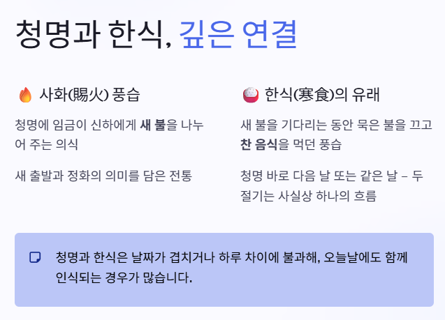 결국 청명과 한식은 서로 연결된 흐름 속에서 형성된 절기이며, 오늘날에도 두 절기는 명확히 구분되지 않고 함께 인식되는 경우가 많습니다.