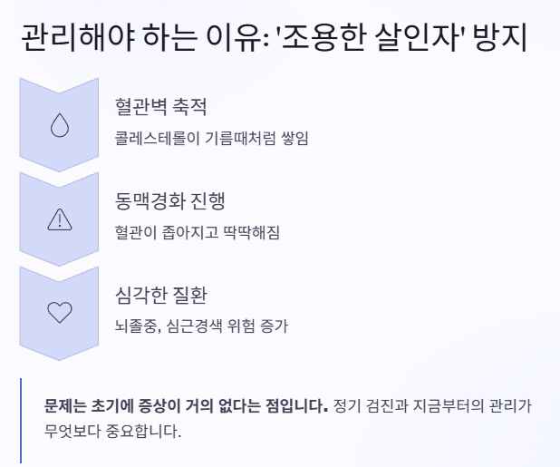 콜레스테롤 수치가 높은 상태가 오래되면 혈관벽에 기름때처럼 쌓이게 돼요. 결국 동맥경화, 뇌졸중, 심근경색 같은 큰 병으로 이어질 수 있어요. 문제는 초기에는 증상이 거의 없다는 점이에요.