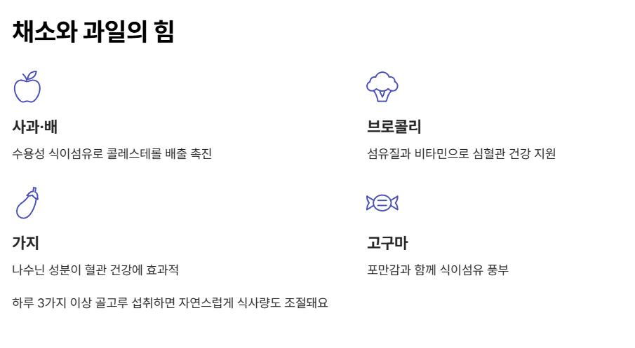 채소와 과일 중에서도 사과, 배, 브로콜리, 가지, 고구마 등은 수용성 식이섬유가 많아 콜레스테롤 배출을 도와요. 하루 3가지 이상을 골고루 섭취하면 체내 흡수를 줄이고 포만감을 높여 자연스레 식사량도 조절돼요.