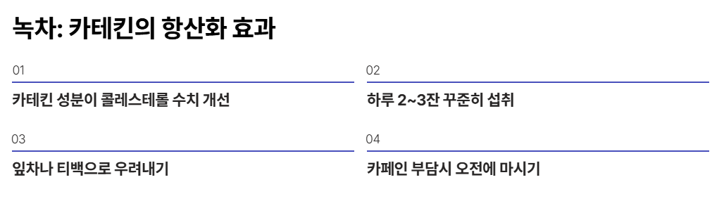 녹차 속 카테킨은 항산화 작용을 하면서도 콜레스테롤 수치를 낮추는 데 도움이 된다는 연구가 있어요. 하루 2~3잔 정도 꾸준히 마시는 게 좋고, 당분이 들어간 병음료보다는 잎차나 티백으로 우려내는 방식을 추천드려요.