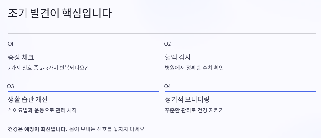 콜레스테롤 수치가 높아도 당장은 아무 문제가 없는 것처럼 느껴질 수 있어요. 하지만 오늘 소개한 7가지 증상 중 2~3가지가 반복된다면, 반드시 병원에서 혈액검사를 받아보는 게 좋아요.