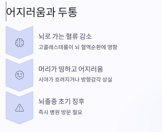 고콜레스테롤 혈증이 있을 경우, 뇌로 가는 혈류에도 영향을 줄 수 있어요. 그 결과 머리가 띵하거나 어지러운 증상이 나타날 수 있는데요, 특히 갑자기 시야가 흐려지거나 방향 감각을 잃는 순간이 있다면 경고 신호로 받아들여야 해요.