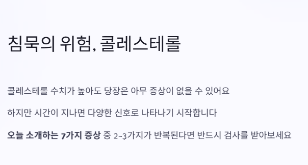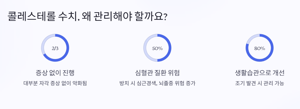 콜레스테롤 수치가 높아도 당장은 아무 문제가 없는 것처럼 느껴질 수 있어요. 하지만 오늘 소개한 7가지 증상 중 2~3가지가 반복된다면, 반드시 병원에서 혈액검사를 받아보는 게 좋아요.