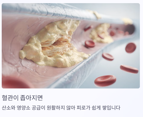 콜레스테롤 수치가 높아지면 혈관이 좁아지고, 산소와 영양소 공급이 원활하지 않아 피로가 쉽게 쌓일 수 있어요.