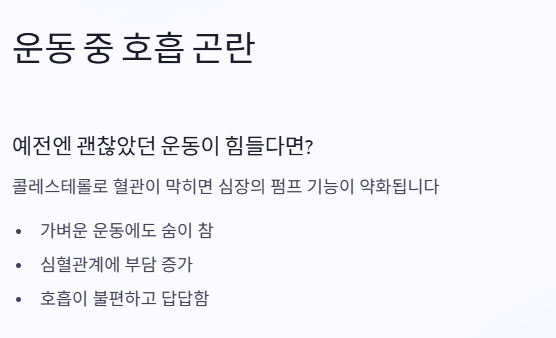 예전에는 가볍게 하던 운동이 어느 순간부터 유난히 숨이 차고 힘들게 느껴진다면, 콜레스테롤 수치가 높아져 심혈관계에 부담이 간 건 아닌지 의심해 볼 필요가 있어요.
