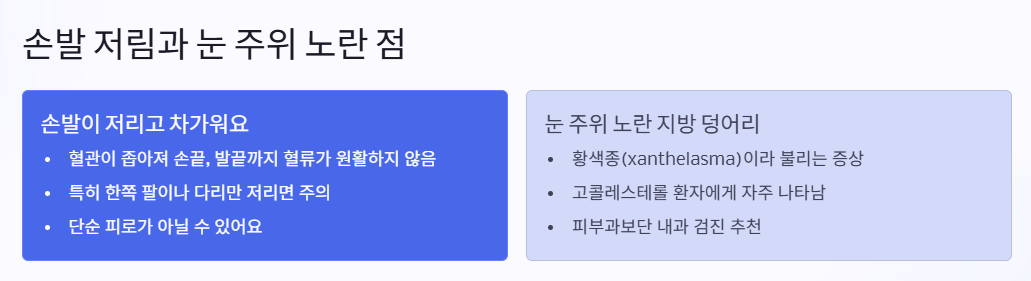 혈관이 좁아지면 손끝이나 발끝까지 혈액이 원활하게 흐르지 않아요. 그 결과 손발이 자주 저리거나 차가워지는 증상이 나타날 수 있어요. 특히 한쪽 팔이나 다리만 저린다면 단순한 피로 문제가 아닐 수도 있으니 주의가 필요합니다.