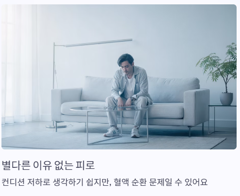 갑작스러운 피로감이나 지속적인 무기력함은 단순한 컨디션 저하로 생각하기 쉽죠. 그런데 별다른 이유 없이 이런 증상이 반복된다면 혈액 순환에 문제가 생긴 건 아닌지 의심해 볼 필요가 있어요.