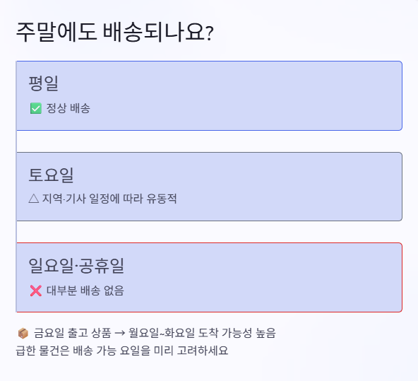 따라서 금요일 출고된 상품은 월요일~화요일 사이에 받는 경우도 흔합니다. 급한 물건이라면 배송 가능 요일도 꼭 고려해 보세요.