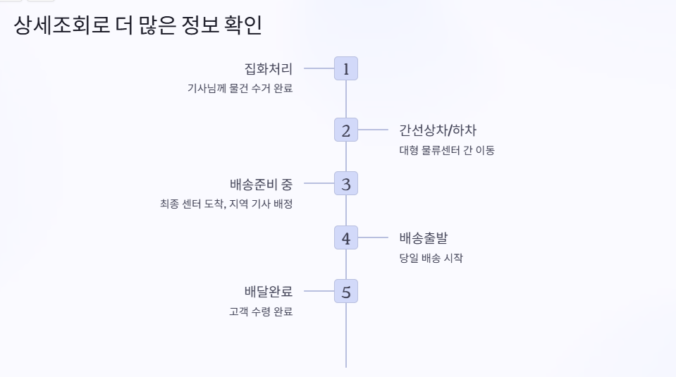 이 단계들을 통해 현재 택배가 어디쯤 있는지 더 정확하게 파악할 수 있으며, 배송 정체 여부도 추정 가능합니다.