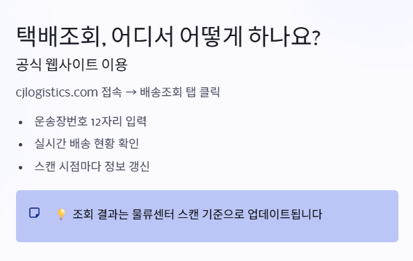 CJ 대한통운 택배를 자주 이용하지만 배송 조회할 때마다 헷갈리셨다면, 이번 글을 주목해 주세요. 운송장번호 입력부터 실시간 확인, 상태 메시지 해석, 고객센터 이용법까지 한 번에 정리했습니다.