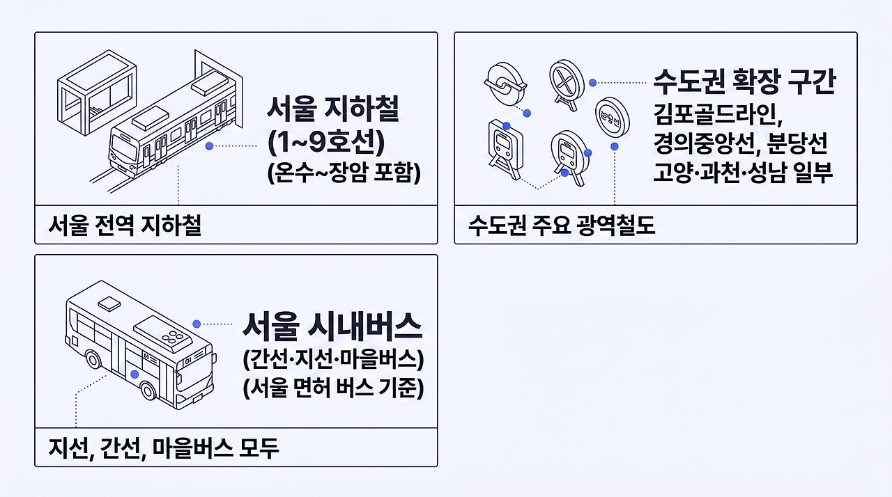 다만 중요한 점은 👉 서울 면허 버스 기준으로 적용된다는 점입니다. 즉, 경기도 버스 중 일부는 사용이 제한될 수 있기 때문에 반드시 확인이 필요합니다.