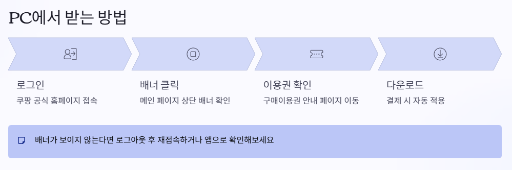 PC 사용자라면 ‘배너 클릭 → 이용권 확인 → 다운로드’의 3단계를 거치게 되고, 그 이후에는 마찬가지로 결제 시 자동 적용되는 방식으로 쿠폰이 활성화됩니다.