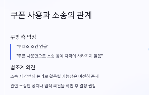 이 부분은 많은 사용자들이 민감하게 받아들이는 주제예요. “이 쿠폰을 쓰면 소송에서 손해배상 못 받는 거 아니냐”는 우려 때문인데요, 쿠팡 측은 명확하게 “부제소 조건은 없다”, “쿠폰 사용만으로 소송 참여 자격이 사라지지 않는다”는 입장을 밝힌 상태예요.