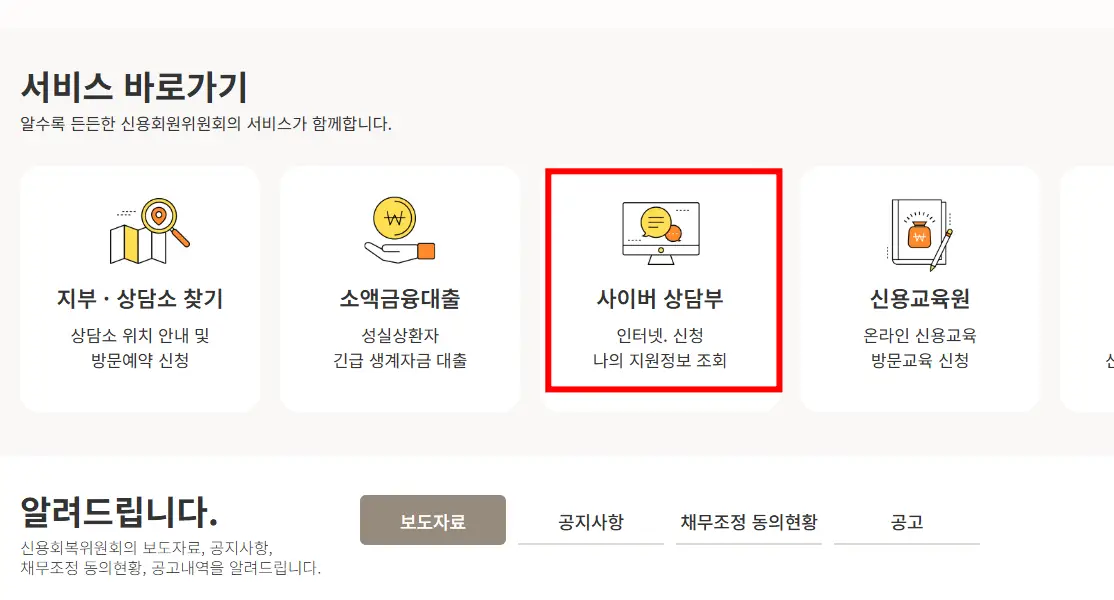 홈 화면에 보이는 메뉴 중 [사이버상담부] → [나에게 맞는 채무조정 진단]을 문구를 클릭하세요.
