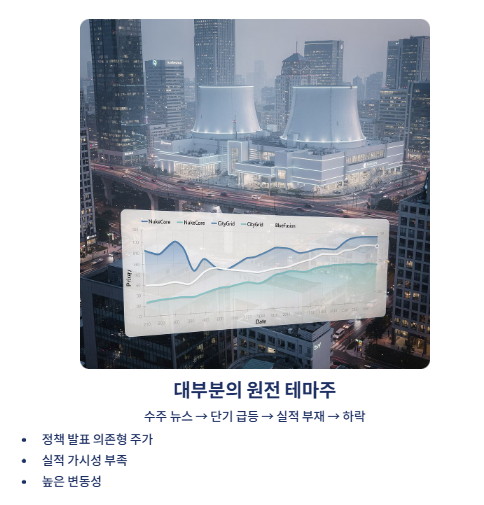 같은 원전 테마 안에서도 기업마다 온도차가 뚜렷합니다. 대부분이 수주 뉴스나 정책 발표에 따라 단기 급등락을 반복하지만, 실적에서는 기대를 충족시키지 못하는 경우가 많습니다.