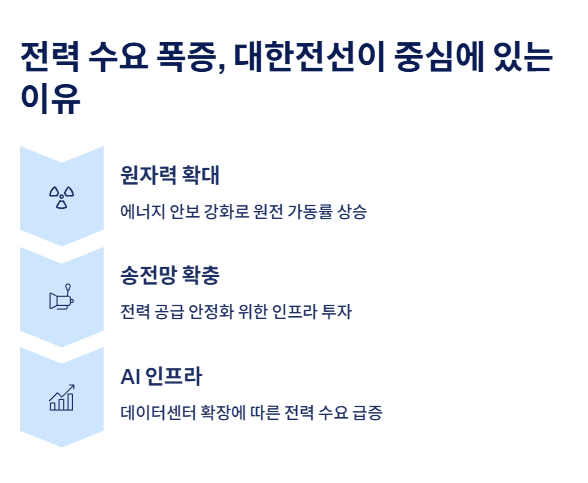 즉, 원자력 확대 → 송전망 확충, 데이터센터 확장 → 전력 수요 증가 → 송전 인프라 투자 증가라는 흐름에서 대한전선은 항상 중심에 있는 구조입니다. 하나의 테마에만 의존하지 않고, 다중 산업에 걸쳐 있는 강점이 주가의 지속성을 가능하게 만듭니다.