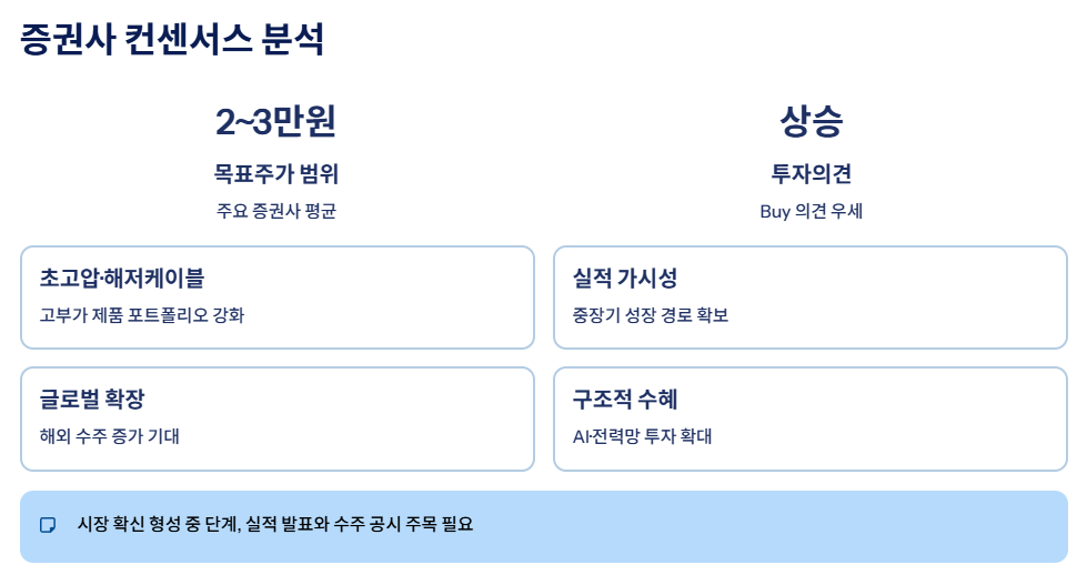 국내 주요 증권사 보고서를 보면, 대한전선 목표주가는 2만 원대 초반에서 3만 원 초반 사이로 형성돼 있습니다. 보고서마다 표현은 다르지만 공통적으로 강조되는 부분은 다음과 같습니다.