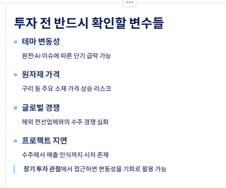 모든 긍정적 요소에도 불구하고 주가에는 항상 변수와 리스크가 존재합니다. 우선 단기적으로는 원자력/AI 테마 변동성에 따라 영향을 받을 수 있고, 글로벌 전선 시장의 경쟁 강도나 구리 등 원자재 가격도 변수입니다.